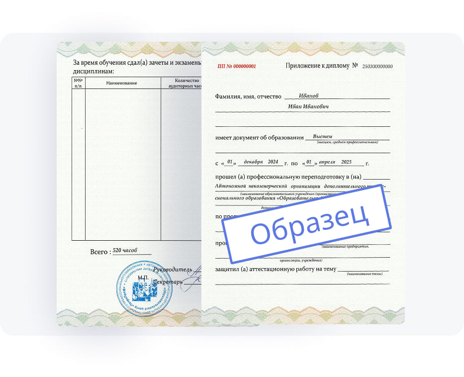 В комплект документов об образовании входит и приложение с оценками после окончания обучения и сдачи итоговой аттестации. Здесь же указывается ФИО обучающегося, наименование учебного центра, длительность пройденного курса, определенная программа переподготовки и другие важные сведения. Именно этот документ станет подтверждением успешного завершения курса и получения профобразования в выбранном направлении.